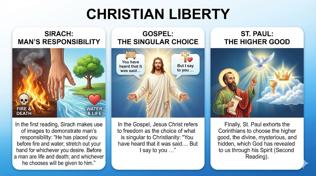 Liberty is an eminently Christian virtue and value. Today’s readings are centered on true Christian liberty. In the first reading, Sirach makes use of images to demonstrate man’s responsibility: “He has placed you before fire and water; stretch out your hand for whichever you desire. Before a man are life and death; and whichever he chooses will be given to him.” In the Gospel, Jesus Christ refers to freedom as the choice of what is singular to Christianity: “You have heard that it was said…. But I say to you …” Finally, St. Paul exhorts the Corinthians to choose the higher good, the divine, mysterious, and hidden, which God has revealed to us through his Spirit (Second Reading).