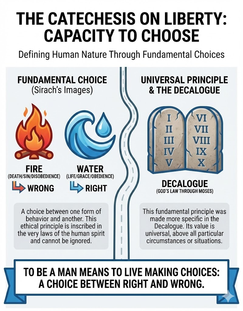The catechesis on liberty begins with an explanation of liberty as the capacity to choose. To be a man means to live making choices, choosing between one thing and another, between one form of behavior and another. The little every day choices are guided by the fundamental choice, the choice which Sirach presents clearly through images: a choice between fire and water, life and death, obedience and disobedience of the commandments, grace and sin. In other words, ” a choice between right and wrong.” This ethical principle is not optional, it is inscribed in the very laws of the human spirit and, therefore, cannot be ignored, without ignoring one’s very humanity.This fundamental principle was made more specific in the Decalogue God gave the Jewish people through Moses, but its value is universal, because above all particular circumstances or situations.