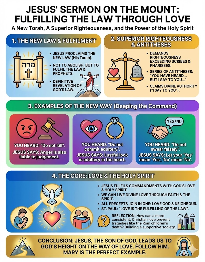 In this Sunday’s Liturgy we continue to read Jesus’ so-called “Sermon on the Mount”. It is contained in chapters 5, 6 and 7 of Matthew’s Gospel. After the Beatitudes, which are the programme of his life, Jesus proclaims the new Law, his Torah, as our Jewish brothers and sisters call it. In fact, on his coming, the Messiah was also to bring the definitive revelation of the Law and this is precisely what Jesus declares: “Think not that I have come to abolish the Law and the Prophets; I have come not to abolish them but to fulfil them”.
