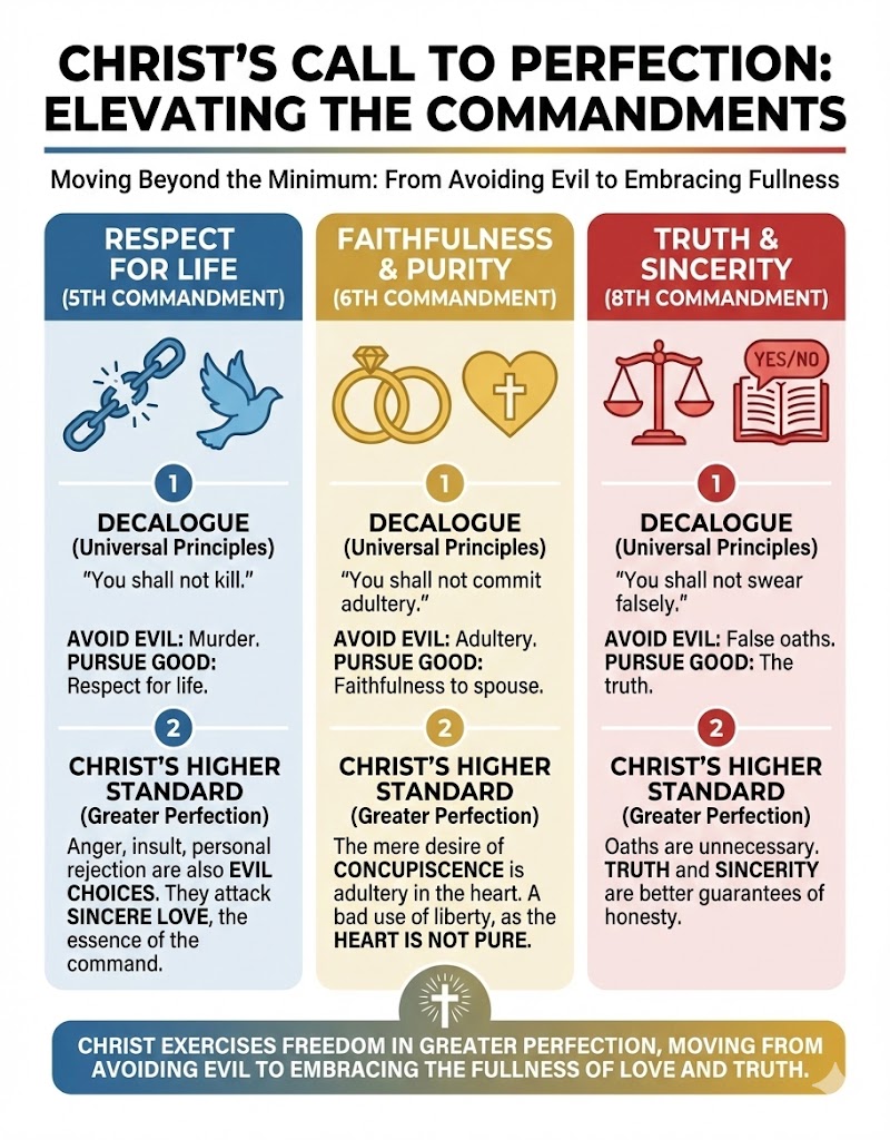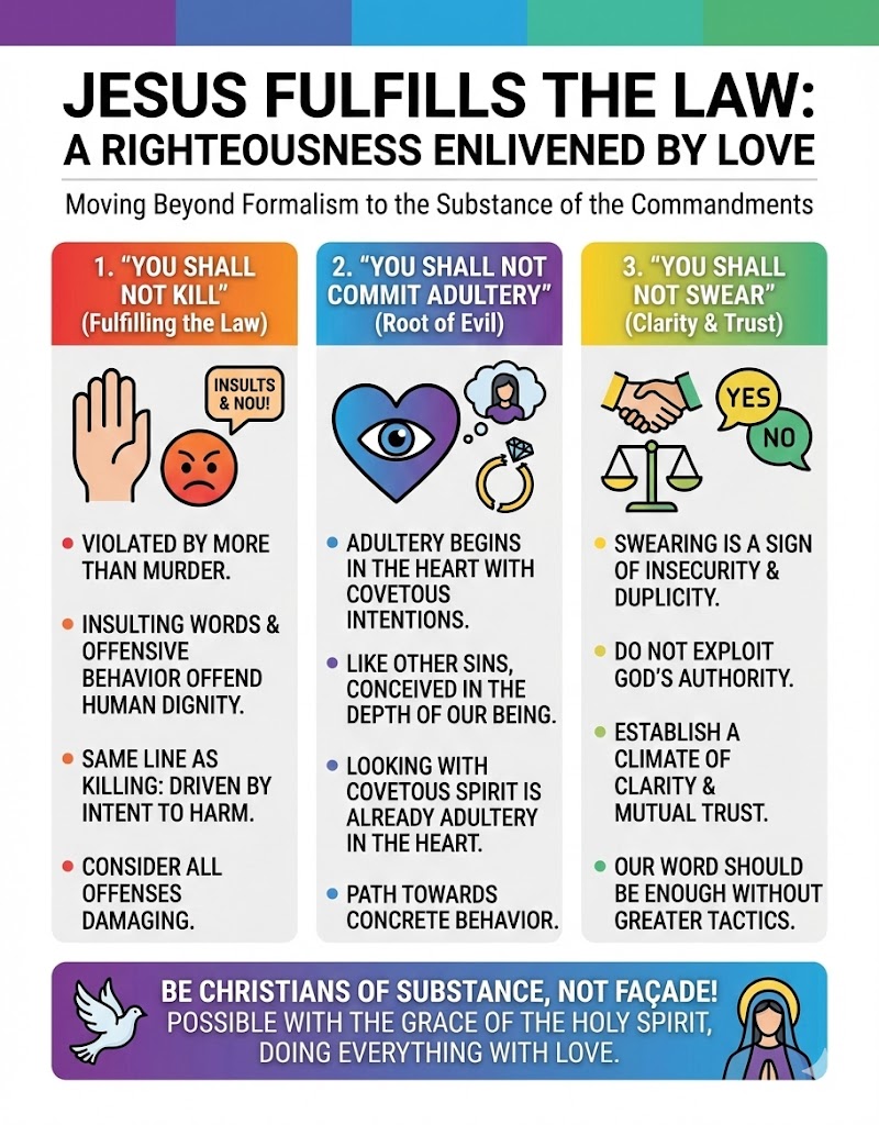 In today’s Gospel, Jesus Christ reminds us of some of these commandments (fifth, sixth and eighth). “You shall not kill.” “You shall not commit adultery.” “You shall not swear falsely.” Human freedom finds in these formulations the evil he must avoid and, implicitly, the good he must pursue: respect for life, faithfulness to one’s spouse, the truth. These are principles valid for all men, Christian and non-Christian alike, especially in the negative formulation. Jesus Christ, however, proposes a higher standard in order to exercise freedom in greater perfection. He makes the commandments more specific than the Decalogue. For Christians to opt for anger, insult, personal rejection are evil choices, violating the fifth commandment and attacking sincere love for one’s neighbor, the essence of the fifth commandment. In so far as the sixth commandment is concerned, the mere desire of concupiscence is adultery in the heart, a bad use of liberty, for the heart is not pure. Finally, Jesus Christ points to truth and sincerity as better guarantees of honesty than oaths.