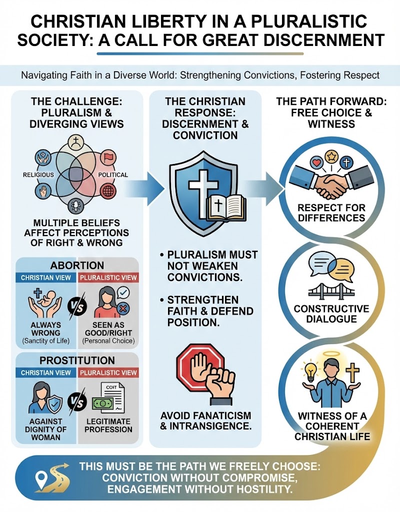 1. Christian liberty in a pluralistic society requires great discernment. Today the Christian faithful live in religious, political and cultural pluralism. This pluralism can affect the way we see right and wrong, and, consequently, the important options in personal or social life. For a Christian, voluntary abortion is always wrong, but in a pluralist society there are those who think it is a good. For a Christian, prostitution goes against the dignity of woman, but there are those who consider it a “profession,” as good and legitimate as any other, etc. This pluralism must not weaken our convictions. It should strengthen them and help us defend our faith and our position, but it must not impel us to fanaticism or intransigence with those who do not share our faith and our morals. Respect for differences, constructive dialogue and, above all, the witness of a coherent Christian life, must be the path we freely choose.