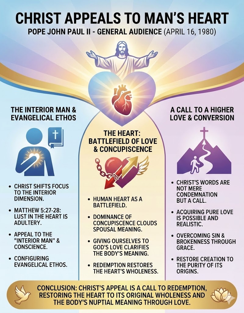 In this way, therefore, Christ appeals to the interior man. He does so several times and under different circumstances. In this case it seems especially explicit and eloquent, not only with regard to the configuration of evangelical ethos,but also with regard to the way of viewing man. Not only the ethical reason, but also the anthropological one makes it advisable to dwell at greater length on the text of Matthew 5:27-28, which contains the words Christ spoke in the Sermon on the Mount.
