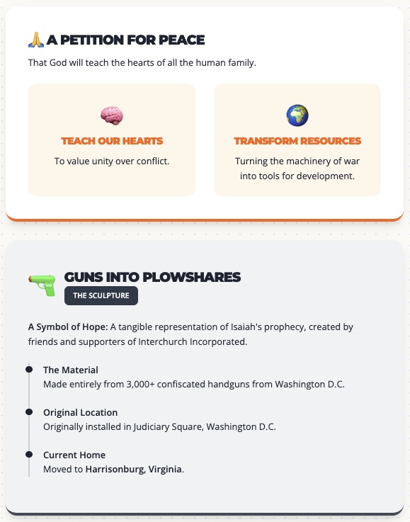 For the gift of peace: that God will teach the hearts of all the human family so that swords may be turned into plowshares and the resources for war into resources for healing and development