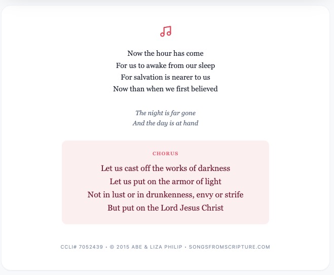 O Lord, call us to arise from our slumber, ever mindful of your approaching presence in our lives. Grant us the wisdom and strength to cast off the darkness of sin, and embrace the light of your salvation.