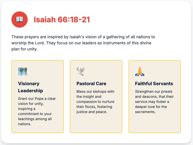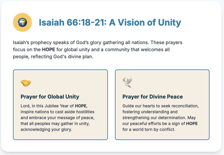 Father, unite your Church in a spirit of hope and love during this Year of Hope. Grant us the courage to walk together in faith, healing the wounds of division and spreading your message of unity and reconciliation. We pray to the Lord...