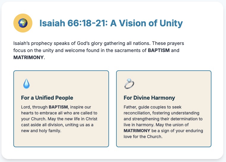 Lord, just as you gather people from every nation, unite families within our parish to worship and grow in faith. Inspire parents to instill hope in their children, guiding them to become messengers of your love. We pray to the Lord...