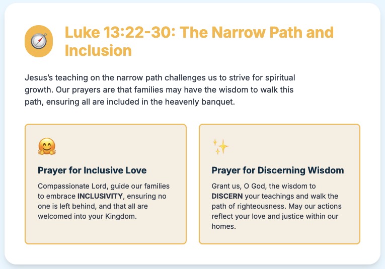 Loving God, we turn our hearts to those with special needs who face adversity in their daily lives. Like Jesus journeying towards Jerusalem, may they find the strength, guidance, and support they need to navigate the challenges before them. Help us to build a more inclusive and compassionate world, where every individual can pass through the narrow gate of love and acceptance.