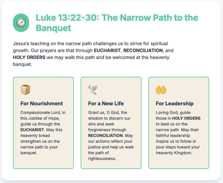 Father, guide those in our community who are called to serve through the Sacrament of Holy Orders. May they lead us with humility and wisdom, as we strive to enter the narrow gate that leads to eternal life. We pray to the Lord...