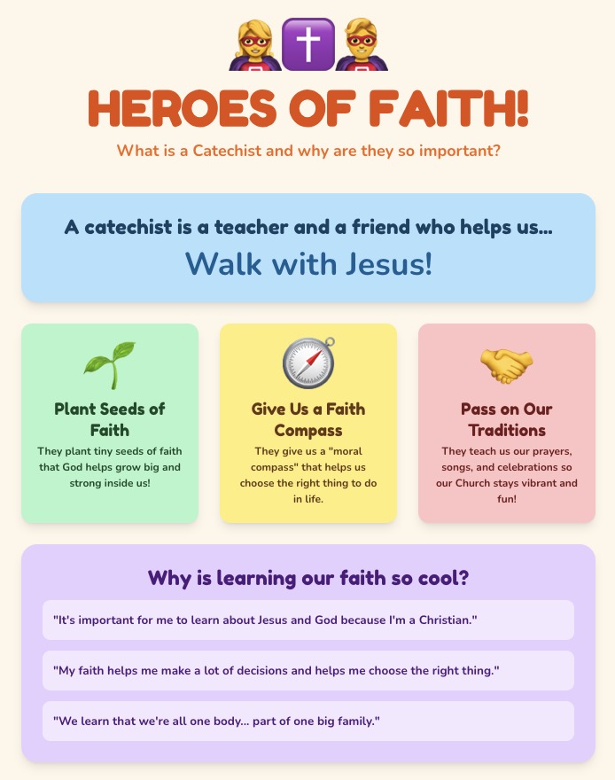 We pray for all the catechists who teach our children. Not only the teachers in the classroom, but parents, grandparents, and other family members who share the truth of the Catholic faith with the children.