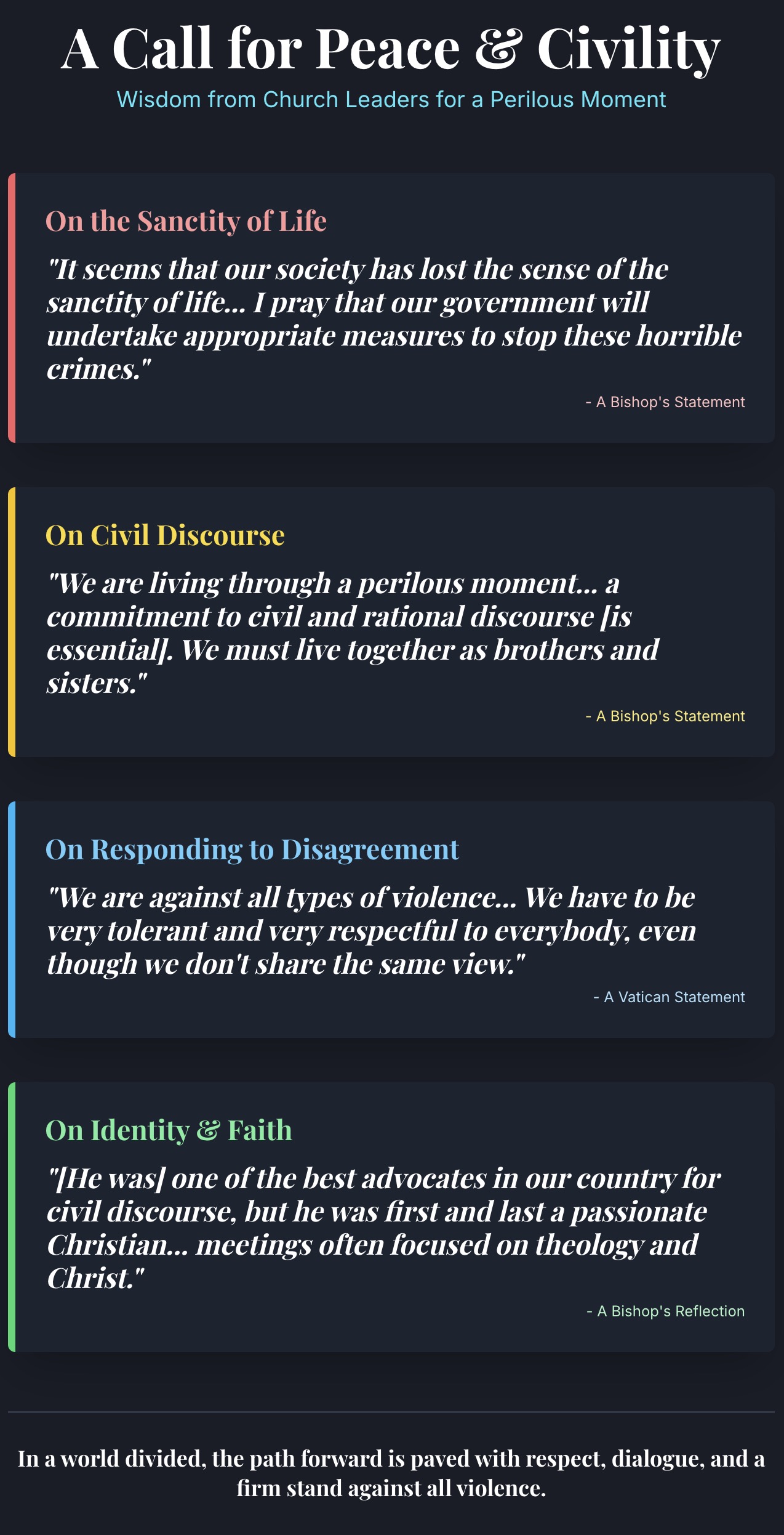 EWTN (20:25) - Bishop Oscar Solless of the Dascese of Salt Lake City where the assassination took place said in a statement, quote, "It seems that our society has lost the sense of the sanctity of life and I pray that our government will undertake appropriate measures to stop these horrible crimes." (September 11, 1025)