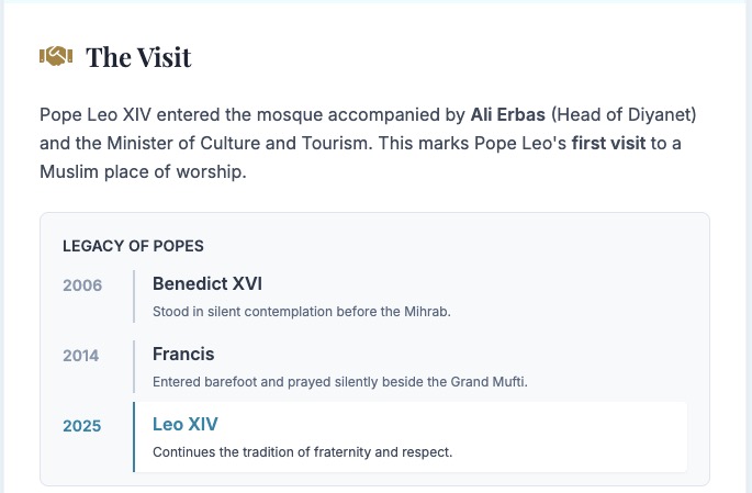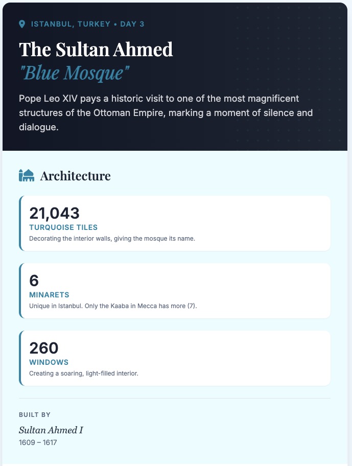 For the Holy Father’s visit to the Blue Mosque; that this gesture of fraternal respect may silence the voices of extremism and deepen the bonds of friendship between Christians and Muslims, showing the world that we are all children of the one Creator. We pray to the Lord