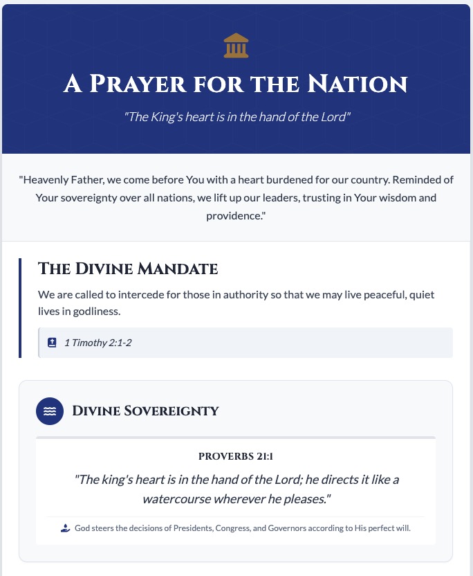 PRAYER FOR THOSE IN GOVERNMENT AUTHORITY (2:54) – God’s Word calls us to pray for our leaders—those in government, positions of power, and authority over nations and communities. In this video, you’ll be guided through a heartfelt, Scripture-based prayer, declaring God’s truth and will over the lives of those who lead.
