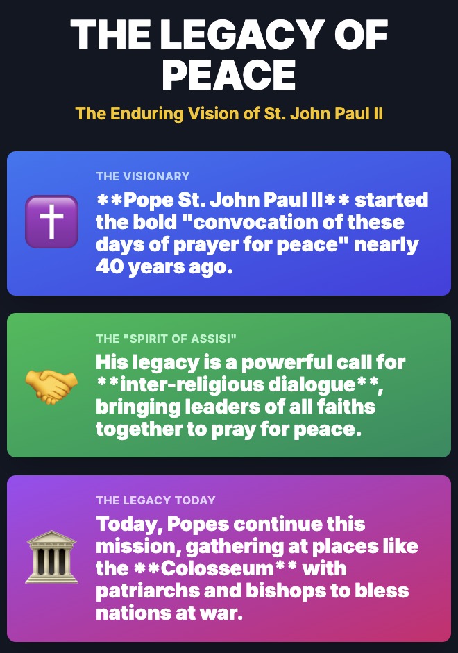 For our Holy Father and all religious leaders, that, following the bold example of St. John Paul II at Assisi 39 years ago, they may tirelessly build bridges of dialogue and unity, presiding over a world that prays together for peace. We pray to the Lord. All: Lord, hear our prayer.