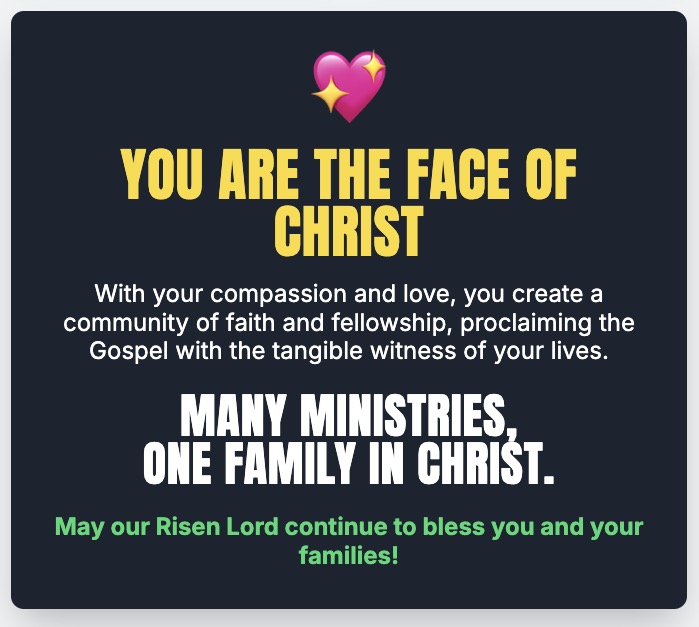 We pray that in our parish, we may understsand that St. Paul’s words are not just for the clergy or staff; it is a call to every single one of us. Paul’s “toil and drudgery” was his work of building the community, and that is our shared work, too. This “work” is found in the ministry of setting up chairs, lectoring at Mass, teaching our children in faith formation, volunteering at the food pantry, and even the simple, vital “work” of welcoming a stranger in the pews.
