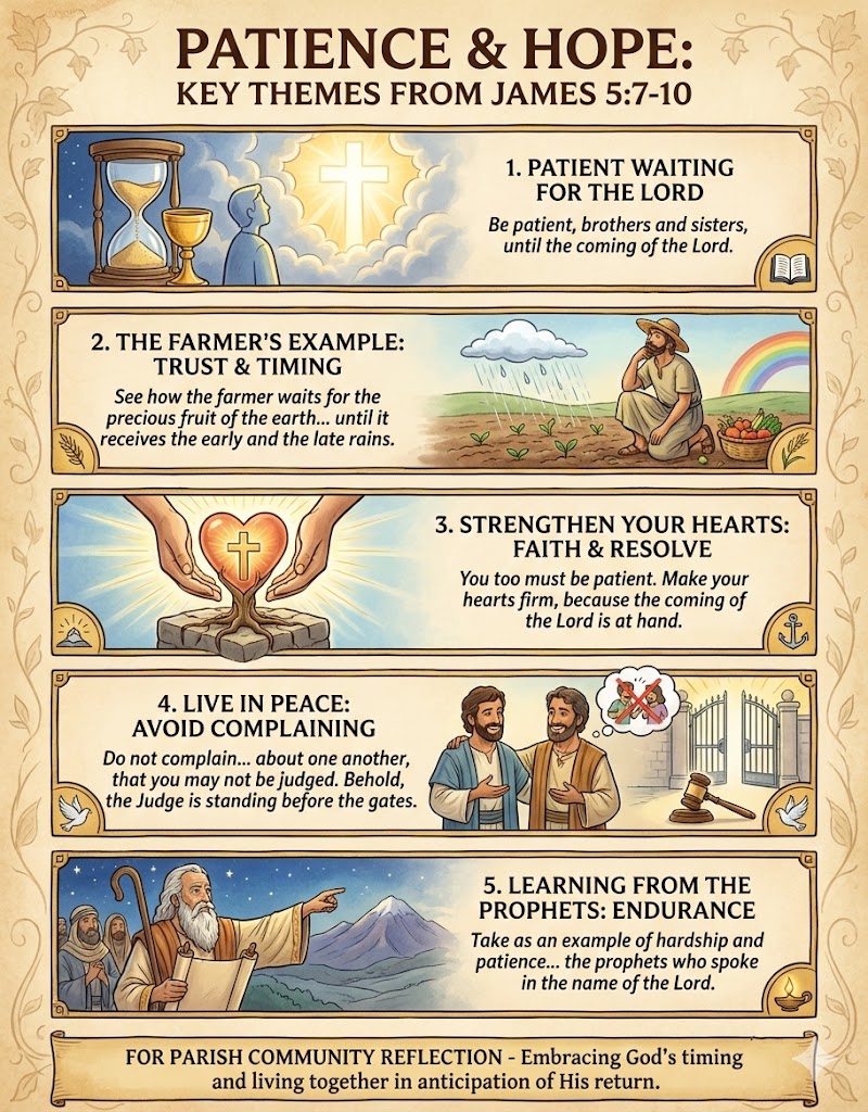 That we may make our hearts firm and patient with one another, avoiding complaints so that we may not be judged. May we treat every member of our community as a brother or sister, knowing the Judge stands before the gates, and letting our unity be a sign of the Lord’s coming. We pray to the Lord…