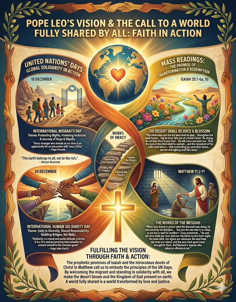 We pray for the human family, that this week’s United Nations’ Days for migrants (18 December) and for human solidarity (20 December) will further Pope Leo’s vision of a world fully shared by all.