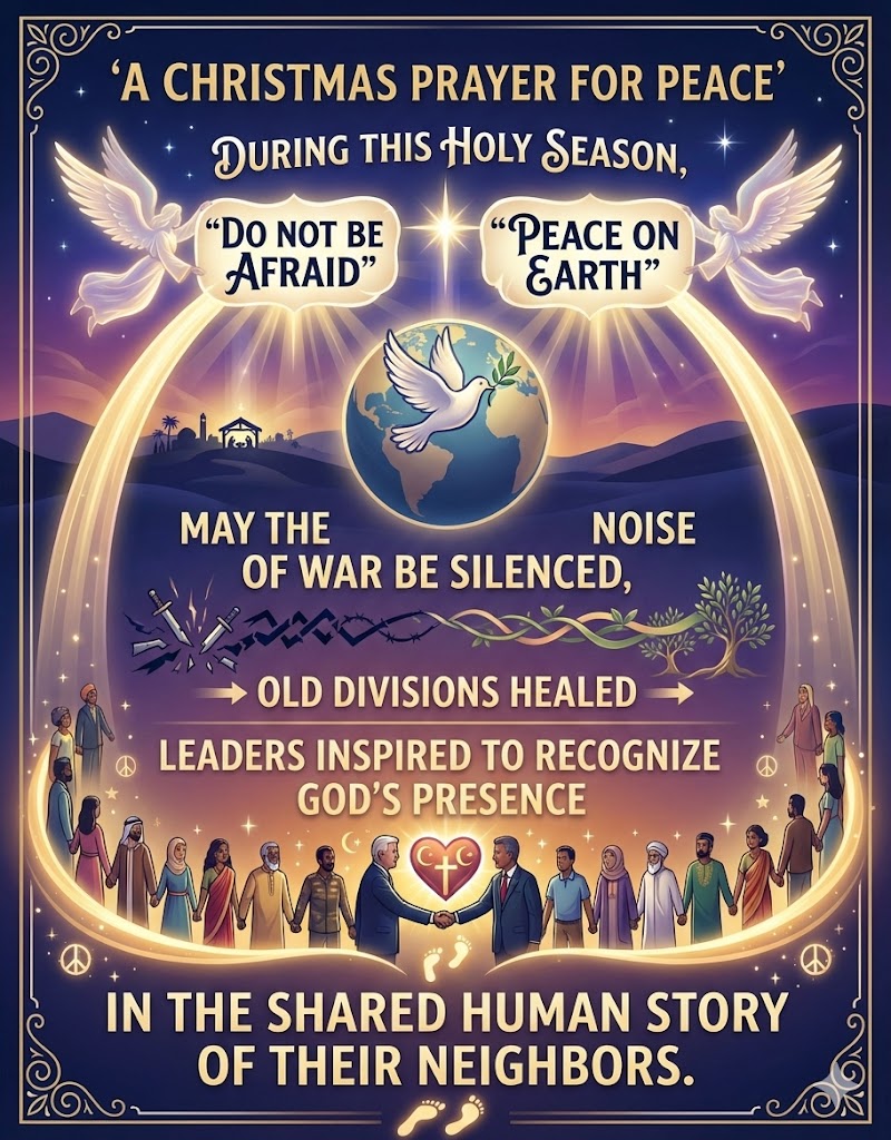 That during this holy season, the angels messages of “Do not be afraid” and “peace on earth” may resound in every troubled corner of our world. May the noise of war be silenced, old divisions healed, and leaders of nations be inspired to recognize Godβs presence in the shared human story of their neighbors. We pray to the Lordβ¦