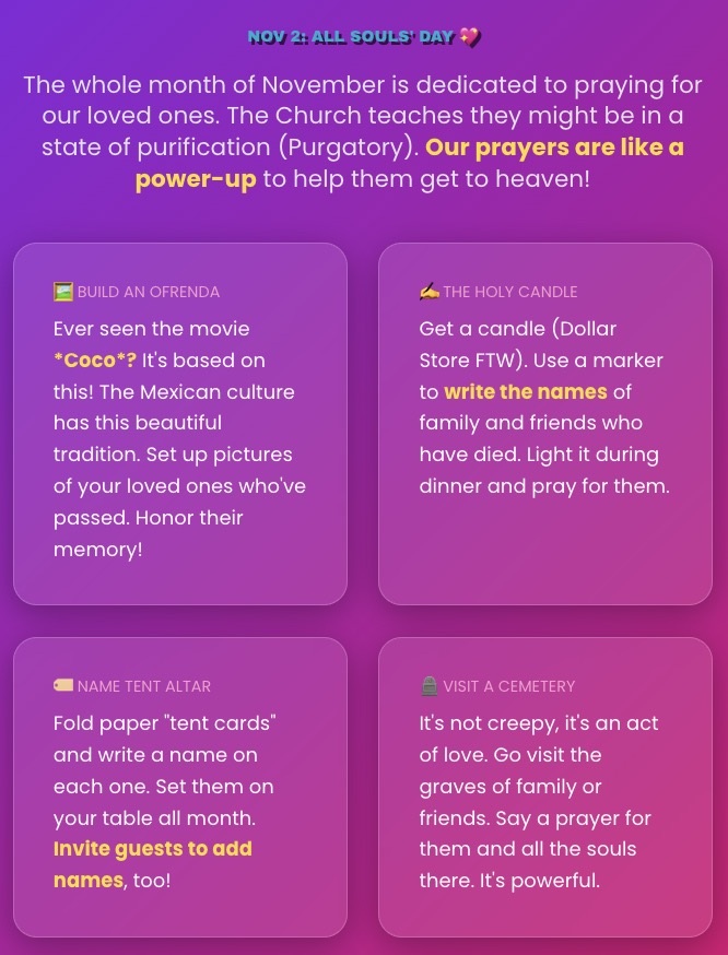 For parents and guardians, that they may find meaningful ways to teach their children about the lives of the saints and the importance of praying for loved ones who have passed away. May our homes beplaces of prayer and remembrance, strengthening our family bond in Christ. We pray to the Lord...