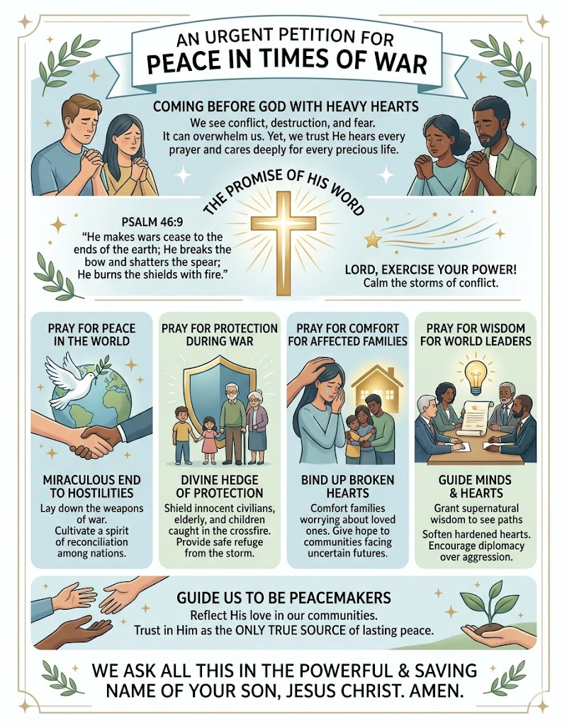In these times of war and deep uncertainty, we come before You with heavy hearts, knowing that the world needs Your presence now more than ever. We see the news of conflict, destruction, and fear, and we confess that it can overwhelm us. Yet, even in the darkest moments, we cling to the belief that You are a God who hears every prayer and cares deeply for every precious life.