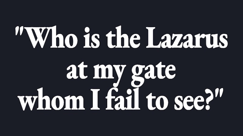 They failed to see the suffering at their doorstep. Frame the homily around the central question: "Who is the Lazarus at my gate whom I fail to see?"