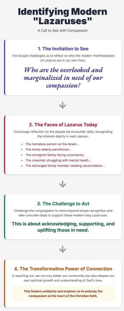 Challenge the congregation to identify the modern "Lazarus" they might be overlooking.