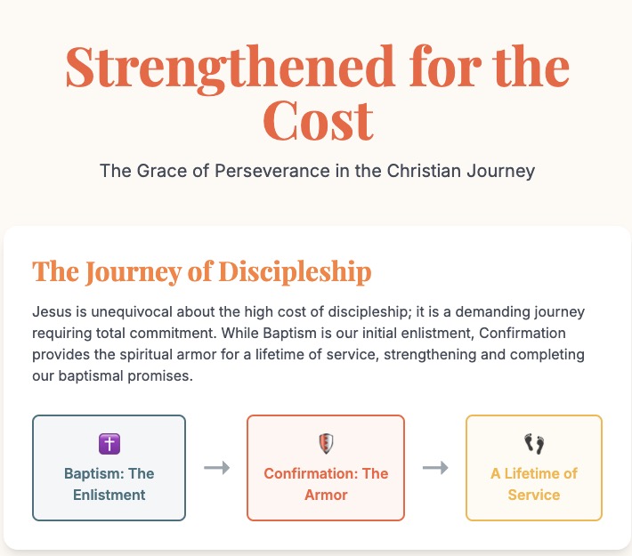 While Baptism is our initial enlistment, Confirmation is the sacrament that provides the spiritual armor for a lifetime of service. It strengthens and completes our baptismal promises, equipping us to endure the challenges of the Christian life.