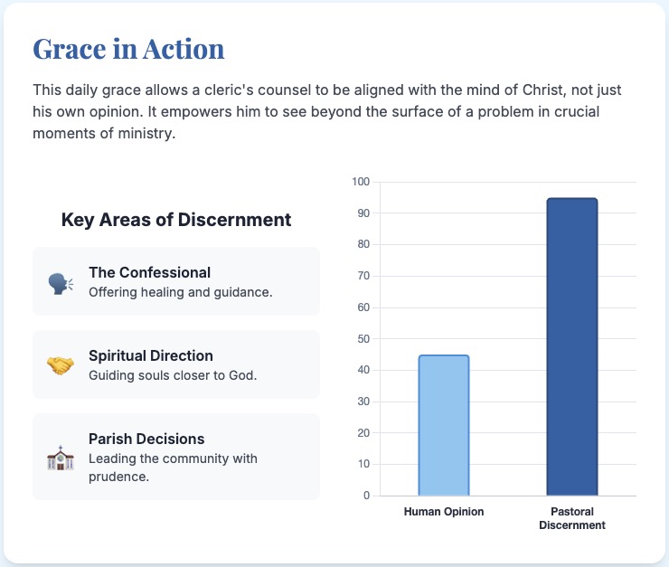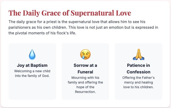 The daily grace for a priest is the supernatural love that allows him to see his parishioners as his own children. It is the joy he feels at a baptism, the sorrow he shares at a funeral, and the patient love he offers in the confessional. This grace empowers him to pour out his life, to send his “own heart” to his people day after day, nourishing, guiding, and protecting the family of God entrusted to his care.