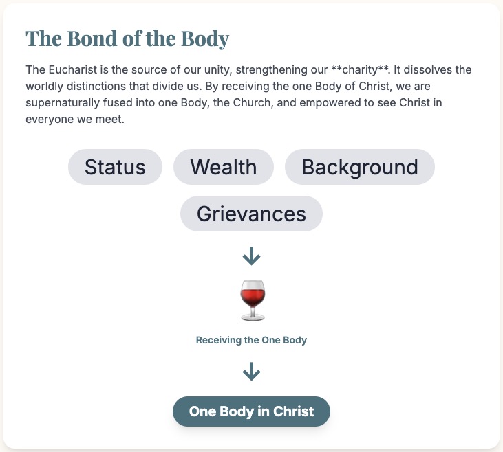 The Eucharist is the very source and summit of this new reality. It is more than a symbol of unity; it is the cause of it. When we approach the altar, all worldly distinctions of status, wealth, and background dissolve. In receiving the one Body of Christ, we are supernaturally fused into one Body, the Church.