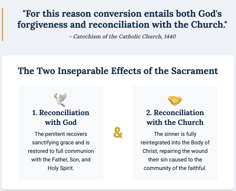 Every sin we commit has a dual effect: it damages our personal relationship with God and it wounds the Mystical Body of Christ, the Church. The grace of this sacrament is therefore twofold, offering both divine pardon and ecclesial repair.