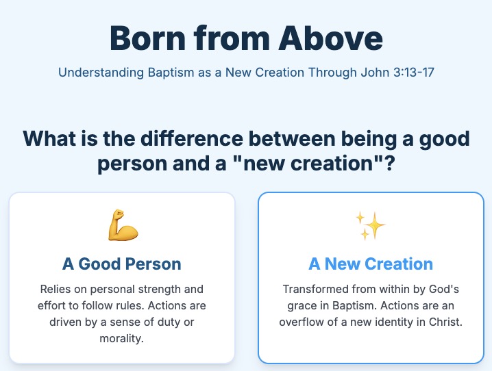 The Gospel connects this rebirth to the cross, stating, “so must the Son of Man be lifted up, so that everyone who believes in him may have eternal life.” Baptism is the moment we are grafted onto Christ and given this eternal life.